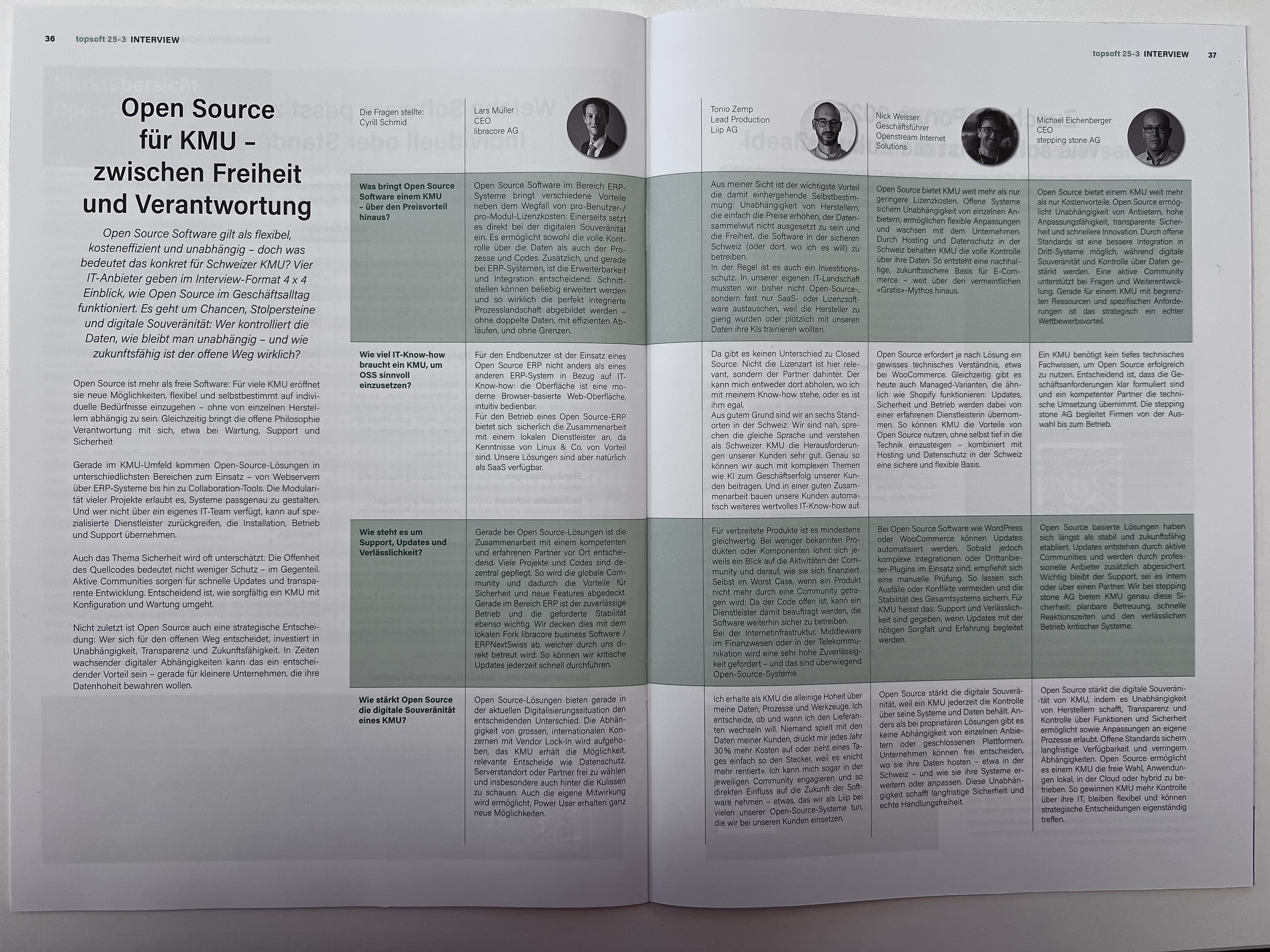 Wir freuen uns, bekannt zu geben, dass unser CEO Michael Eichenberger in der neuen Ausgabe des topsoft Fachmagazins vertreten ist. Im Rahmen des 4x4-Interviews zum Thema «Open Source für KMU – zwischen Freiheit und Verantwortung» teilt Michael seine Erfahrungen und Einschätzungen dazu, welche Chancen Open Source für Schweizer KMU bietet, insbesondere im Hinblick auf digitale Souveränität, Flexibilität und langfristige Skalierbarkeit.